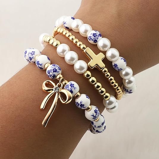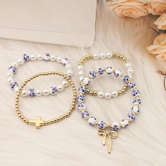 BATHRINS 4 Pcs Stackable Stretch Beaded Bracelets for Women Cross Bow Pearl Bracelet Trendy Vintage Jewelry